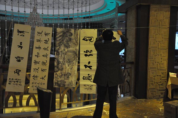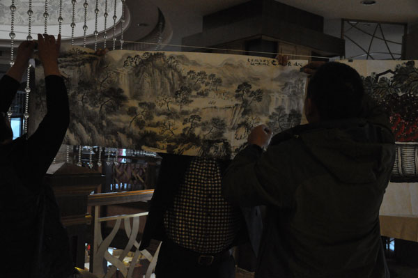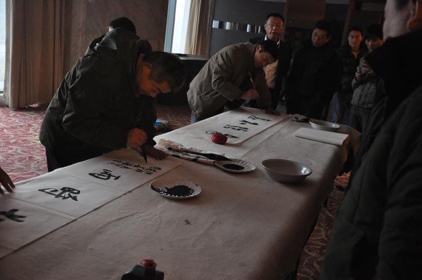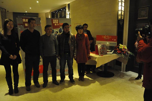 会前大家商量,利用这次活动为在中西医结合医院治疗的定远县岱山乡的十三岁患尿毒症少年郑庆男募捐。小庆男的父母都是农民,孩子的患病治疗使家中生活难以为继,中西医结合医院的主任医师俞凯呼吁社会救助。当晚李晓秋会长在台上大声疾呼请大家关爱病童,献出爱心多少不限,并带头捐献500元,一并前去的商屏秘书长、胡新忠秘书长、徐政爱心大使及五电机器商会的企业家纷纷捐献500元——1000元。李晓秋并带去两幅四条屏书法作品,在台上展示,谁捐1000元,就赠送书法四条屏,并表示只要捐给孩子1000元,就送四条屏,当场就有多人认捐,范正海、许正波等中书协会员向捐款者赠送书画作品,台下纷纷响应,将活动推向高潮。当晚共获得善款35000元,隔日送到医院交到病中孩子父母手中,作为孩子专项治病用款。