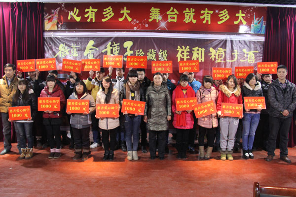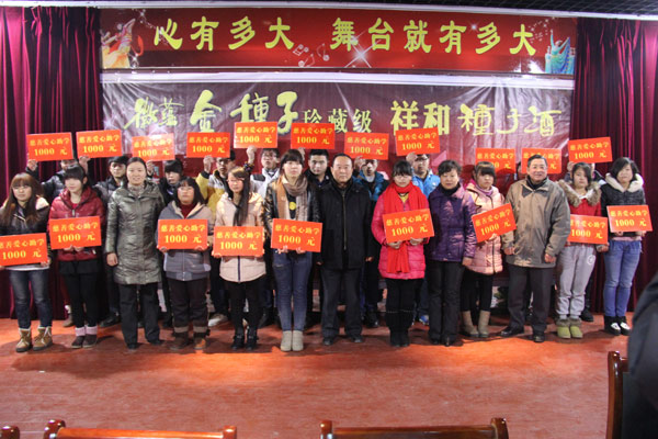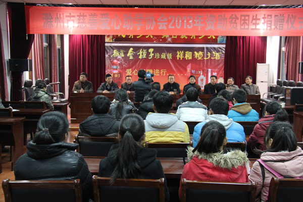 1月16日下午,由滁州市慈善爱心助学协会与祥和金种子酒业共同携手来到乌衣中学,联合举办资助2013年贫困学生捐赠大会。慈善爱心助学协会的参会领导有会长李晓秋,副会长王学山、张春林、宋家明,副秘书长白礼华、黄平一。祥和金种子酒业的参会领导有总经理孙宗培,大区杨经理等。乌衣中学和南谯区邵区长等共同做了热情接待。 首先,邵长玲副区长代表区政府向前来捐赠的爱心人士表示衷心的感谢和崇高的敬意。希望受助学生能够做到自尊、自信、自立、自强,能够把党和政府的关心,社会各界人士的关爱转化为努力学习,早日回馈社会的一种动力。随后,李晓秋主席也发表了讲话,他用多个鲜活的事例做生动的教材,激励同学们勇敢地面对生活中的各种挫折。并希望同学们牢记,只要开始努力,永远都不晚;只有努力,才能成功的道理。祥和金种子酒业的杨经理也作了重要讲话,表示要多做善事,回馈社会。 最后,与会领导向23名受助学生现场发放了每人1000元的爱心款,并合影留恋。其中10名学生由祥和金种子酒业直捐。