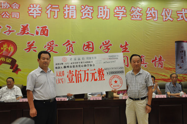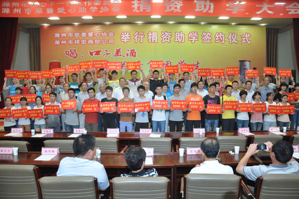 在热烈的掌声中,大会举行了由滁州市祥宏商贸公司向我会捐资100万元(分五年到帐)的正式签约仪式。市政协委员、我会副会长、市祥宏商贸公司董事长张圣宏同志,在签字仪式上发言。他从一个民营企业家的角度,道出了关爱贫困学生、传递人间真情、承担社会责任、建设美好滁州的肺腑之言。得到了全体与会者的高度赞扬。