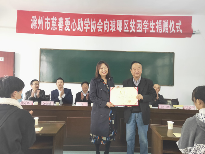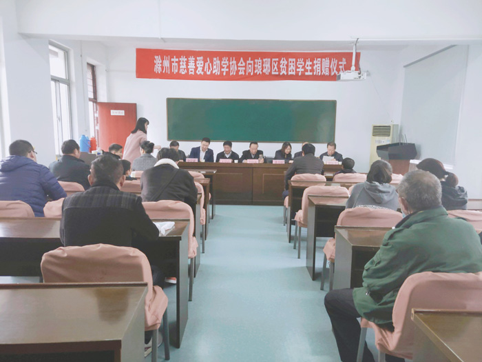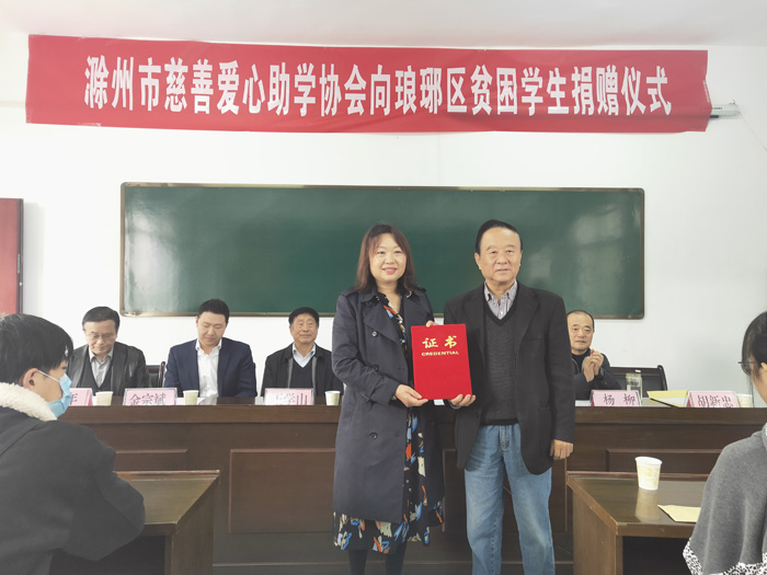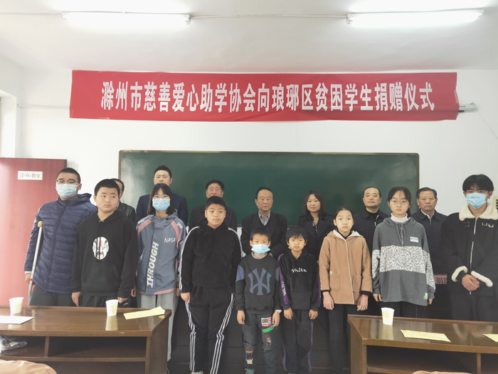 11月15日上午,滁州市慈善爱心助学协会携手爱心企业滁州美众汽车文化生活广场开发有限公司和安徽泓信汽车销售服务有限公司在琅琊区关工委举行向贫困学生捐赠仪式。滁州市关工委常务副主任、市慈善爱心助学协会创会会长李晓秋,市慈善爱心助学协会领导组副组长王学山,市慈善爱心助学协会常务副会长胡新忠,琅琊区关工委主任杨柳,琅琊区关工委常务副主任洪万年,滁州美众汽车文化生活广场开发有限公司董事长金宗斌,安徽泓信汽车销售服务有限公司总经理孙方琼参加了捐赠仪式。10名贫困学生受到资助,每人获得助学金2000元,共计发放助学金20000元。