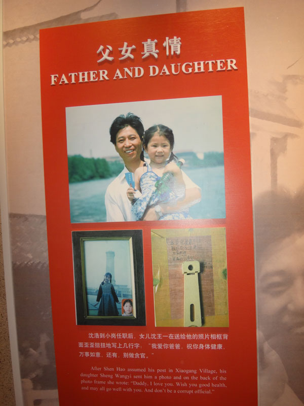 沈浩到小岗任职后,女儿沈王一在送给他的照片相框背面歪歪扭扭地写上几行字:“我爱你爸爸,祝你身体健康,万事如意,还有,别做贪官。”