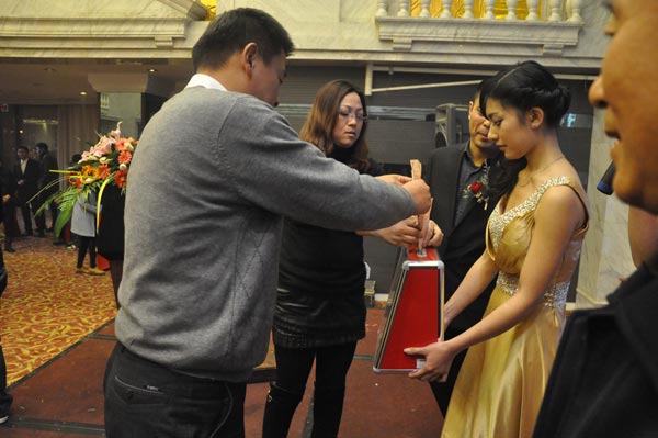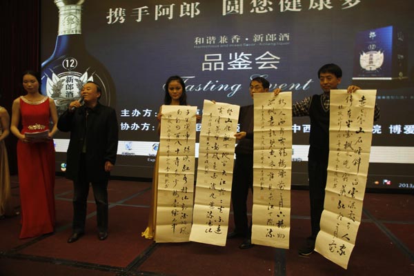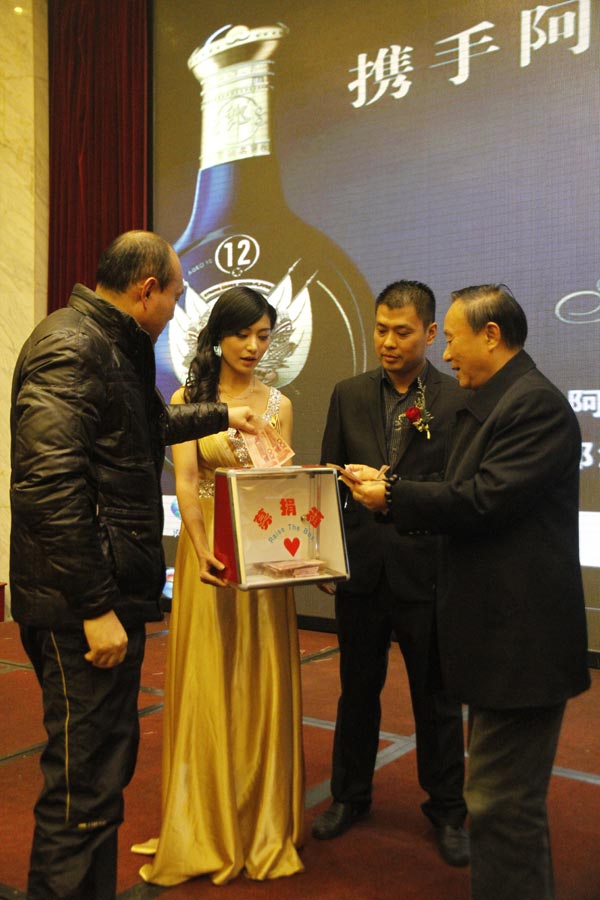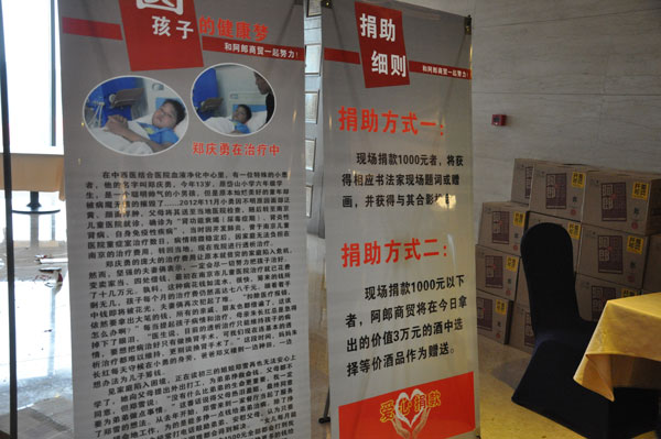 12月7日,滁州阿郎商贸公司成立,并在君家酒店发布郎酒滁州总代理新闻推介会,约有200人参加了这次活动。阿郎商贸公司曹锋经理,博爱文社范正海书法家,滁州五金机电商会的部分领导,市慈善爱心助学协会的会长李晓秋,副秘书长商屏,爱心大使徐政,市政协副秘书长胡新忠等领导出席。 会前大家商量,利用这次活动为在中西医结合医院治疗的定远县岱山乡的十三岁患尿毒症少年郑庆男募捐。小庆男的父母都是农民,孩子的患病治疗使家中生活难以为继,中西医结合医院的主任医师俞凯呼吁社会救助。当晚李晓秋会长在台上大声疾呼请大家关爱病童,献出爱心多少不限,并带头捐献500元,一并前去的商屏秘书长、胡新忠秘书长、徐政爱心大使及五电机器商会的企业家纷纷捐献500元——1000元。李晓秋并带去两幅四条屏书法作品,在台上展示,谁捐1000元,就赠送书法四条屏,并表示只要捐给孩子1000元,就送四条屏,当场就有多人认捐,范正海、许正波等中书协会员向捐款者赠送书画作品,台下纷纷响应,将活动推向高潮。当晚共获得善款35000元,隔日送到医院交到病中孩子父母手中,作为孩子专项治病用款。