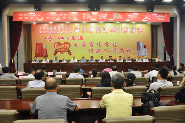 市关工委和我会于8月26日下午在市政务中心东楼一号会议室,隆重举行2014年度捐资助学大会,我会部分会员和受资助的贫困学生代表共300余人参加了大会。应邀出席大会的市领导同志有:市人大主任李耀才,市人大副主任秦刚昌、朱云霞,市政协副主席查镜波、李庆宁,市关工委领导陈家声、陈六、黎田、李晓秋、白运河、许学明,我会领导李晓秋、常务副会长、副会长和驻会工作人员全部出席。我会特聘的顾问单位负责同志,滁州市广播电台、电视台、报社、网站、部分驻滁记者站也参加会议。