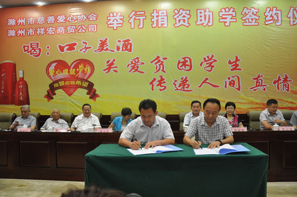 在热烈的掌声中,大会举行了由滁州市祥宏商贸公司向我会捐资100万元(分五年到帐)的正式签约仪式。市政协委员、我会副会长、市祥宏商贸公司董事长张圣宏同志,在签字仪式上发言。他从一个民营企业家的角度,道出了关爱贫困学生、传递人间真情、承担社会责任、建设美好滁州的肺腑之言。得到了全体与会者的高度赞扬。
