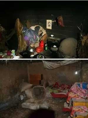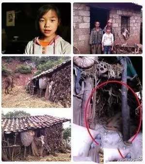 【一个睡在草堆里的女孩】这是你无法想像的:李捌芬,多姑小学三年级学生。爸爸因哮喘病失去劳动能力,妈妈有严重的妇科病,哥哥去广东打工绝了音信。合影背景是他们的房子,而李捌芬的“卧室”是柴房,门前有驴圈,破布帘挡门,右下图中红圈内,是她的床——以草为席,以麻布为被。