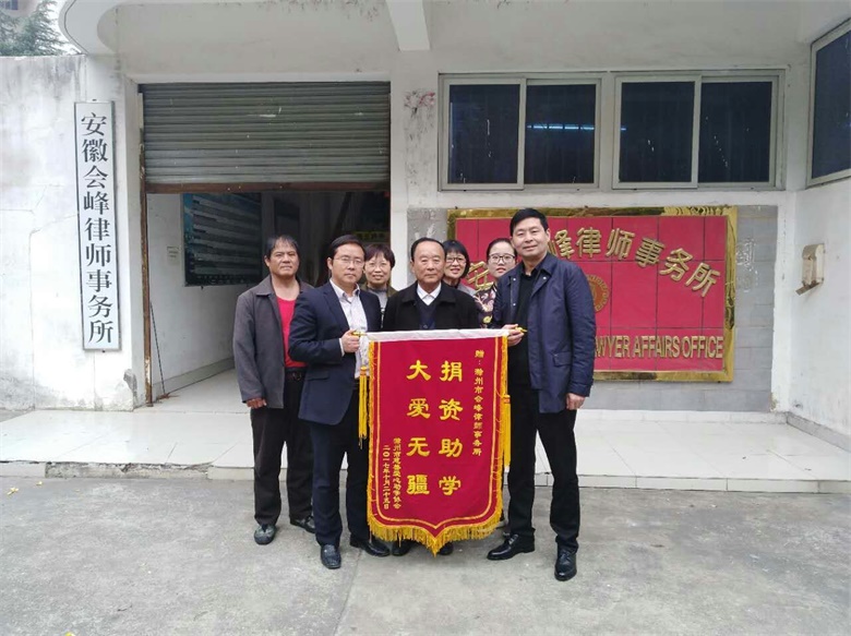 协会领导李晓秋,郑东兰,任丽同,向会峰律师事务所赠送锦旗。多年來所主任倪升山义务为协会担任法律顾问,今年來又捐赠15万元,为农村三所学校,提供饮水机23台,并提供五年的维护费用,使农村学子能够饮到干净安全的开水,保障了学生们的健康,受到学校师生的交口称赞。